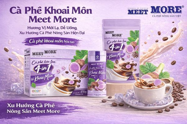 Trong bối cảnh người tiêu dùng ngày càng quan tâm đến cà phê sáng tạo, dễ uống và tốt cho sức khỏe, các dòng cà phê truyền thống dần nhường chỗ cho những sản phẩm kết hợp giữa cà phê và nông sản tự nhiên. Nổi bật trong xu hướng đó chính là cà phê khoai môn Meet More – dòng cà phê khoai môn hòa tan đang được nhiều khách hàng và đối tác kinh doanh lựa chọn.