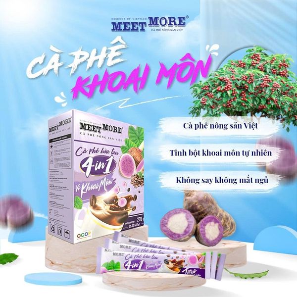 Khoai môn là củ quả dễ gắn với cảm giác “quê nhà”, “nhớ tuổi thơ” – khi đưa vào cà phê, tạo sự khác biệt rất rõ. Dòng hòa tan 4in1 vị khoai môn của Meet More đã được phân phối.