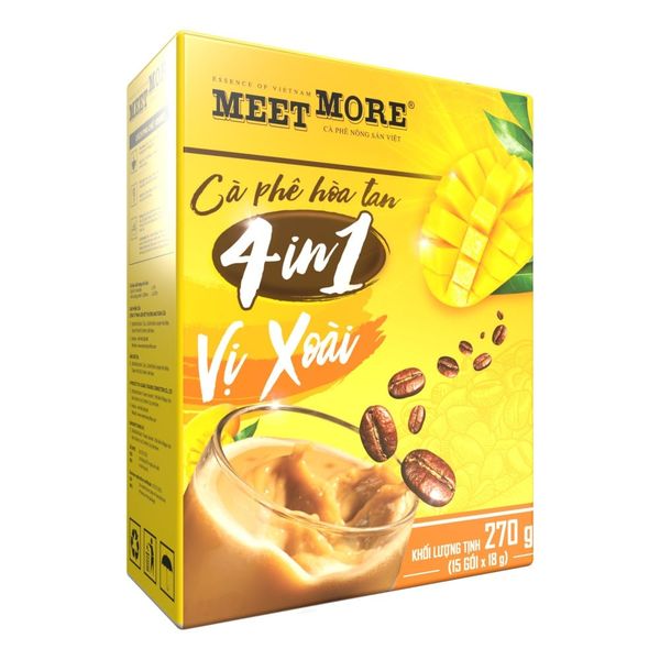 Xoài là trái cây mùa hè, vị chua ngọt thanh, dễ chịu – khi kết hợp cà phê, tạo ly đồ uống tươi mới, năng động. Trên website sản phẩm của Meet More có dòng “hộp cà phê hòa tan vị xoài”.