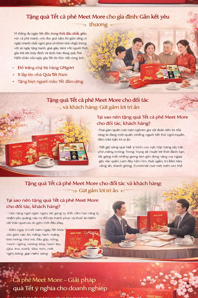 Thực tế cho thấy, quà Tết ngày nay không chỉ cần đẹp mà còn phải dùng được, có ý nghĩa và mang thông điệp tích cực. Chính vì vậy, những năm gần đây, cà phê làm quà Tết – đặc biệt là cà phê Meet More – đang trở thành xu hướng được nhiều cá nhân và doanh nghiệp lựa chọn.